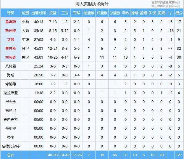 里夫斯32分7板6助、东契奇30分11板13助3帽、斯玛特21分3板2助5断、詹姆斯17分6板5助2断、艾顿9分9板2助、八村塁6分4板、海斯5分4板、拉拉维亚4分1板1助