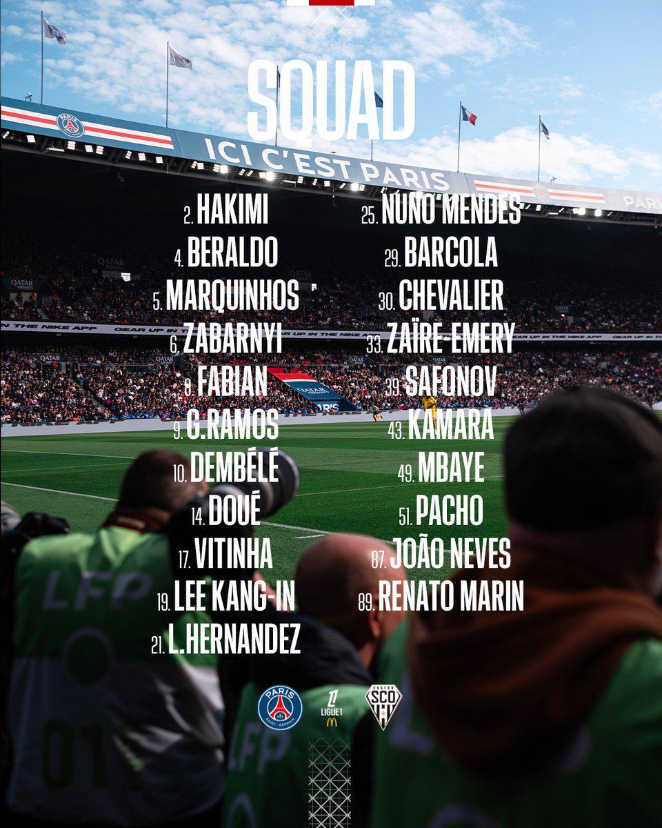 后卫:2-阿什拉夫、4-贝拉尔多、5-马尔基尼奥斯、6-扎巴尔尼、21-卢卡斯-埃尔南德斯、25-努诺-门德斯、43-诺哈姆-卡马拉、51-威廉-帕乔